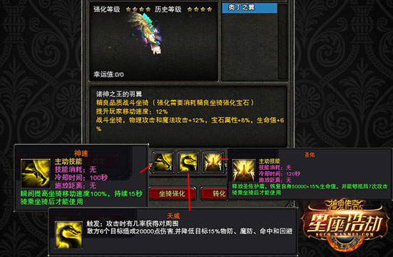 除了超高的属性提升,还附带两大神技哦!首先是【天威】技能,攻击时有几率触发,会对周围敌方6个目标造成20000点伤害,并降低目标的15%物防、魔防、命中以及回避;其次是【圣佑】技能,这是一个主动技能,玩家可在危急时刻使用,释放圣佑护盾,回复50000+15%生命值,并能够抵挡7次攻击哦!